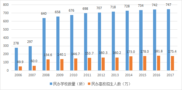 扩建当然需要资金。前面我们提到高等教育毛入学率从2003年的17%提升至2017年的45.7%,除了财政经费的持续投入,民间资本也起着不可替代的作用。若要将民办高校的发展做个阶段性划分,可以分为三个阶段:①野蛮生长;②内在管理;③强者恒强。