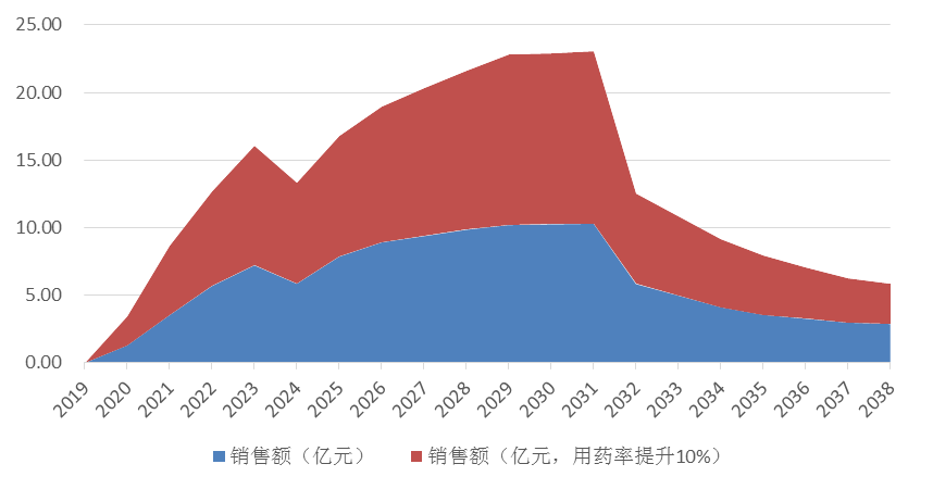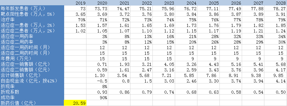 下面将通过一个例子来演示一下大体的估值过程。对于某抗肿瘤新药,目前同靶点进度第一,共有2个适应症处于3期。假设:1)适应症一二的成功概率均为90%;2)未来峰值时该品种在适应症一有望达到35%渗透率、适应症二30%渗透率;3)核心专利2032年到期,到期后大量仿制药加剧竞争;4)2020年获批上市;5)年费用15万,2024年进医保后年费用9万;6)用药时间:适应症一12个月,适应症二15个月;7)折现率8%。根据模型测算,该新药价值20.59亿元。