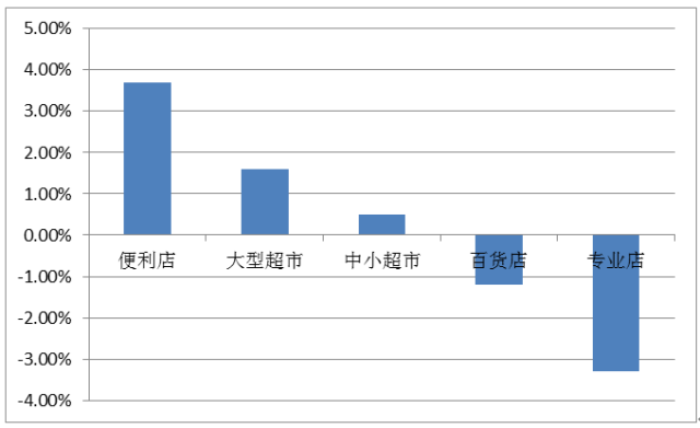 尽管零售整个行业增速放缓,但两极分化现象初显:便利店显现出强劲的增幅,而其他的专业店、中小超市、百货等业态增速停滞。