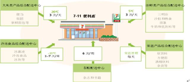 7-Eleven的物流配送体系也是非常出色,它建立了多温带复合物流体系:同一送货车辆可装载不同温度范围的商品。具体而言,常温商品每天配送一次,如软饮料、酒精饮料、杂货等;冷藏食品如三明治、沙拉和熟食、面条、牛奶饮料等,每天配送三次;冷冻食品如冰淇淋、冷冻食品、冰块等一周3-7配;杂志与书为一周六配送一次。