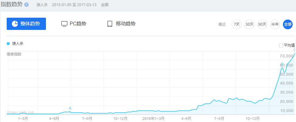 可以结合关键字“狼人杀”的百度指数变化来回答这个问题。从过去四年的走势来看,第一波崛起是在2015年的6月份,指数有一个翻倍的上涨,当时是直播平台战旗凭借旗下众多游戏主播,推出了lyingman这款狼人杀节目;而在2016年6-7月又有一个显著的提升,主要是熊猫tv推出了pandakill。随后,马东推出了《饭局的诱惑》这档吃饭聊天和狼人杀相结合的明星综艺节目,使得狼人杀游戏持续发酵。同年12月,天天狼人杀和狼人杀两款重量级app相继上线,并不断改进更新,进一步把狼人杀推向了爆发式的增长。