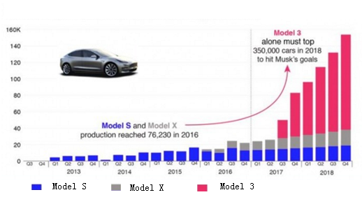 图:特斯拉三款车型:Model S, Model X和Model 3的历史销量及预期销量