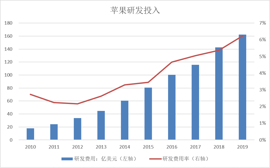 市场对苹果的质疑,看到的只是硬件方面的对比,而苹果相比于其他厂商,最大的优势在于基于硬件、软件、服务的整合创新优化。在全球化的时代里,合作分工的模式让行业参与者各司其职,有些公司专注研发操作系统,有些专注做手机芯片,有些则是采购零部件生产手机,但只有苹果把整个生态做到了极致,给用户带来绝佳的体验。以拍摄为例,几乎每一代的iPhone像素都低于其他品牌的旗舰机型,但仍然具有很好的拍照效果,这其实就是系统、软件与硬件做到了集成优化。从苹果公司的研发投入数据来看,近几年持续攀升,研发费用率从2012财年的2.2%提升至2019财年的6.2%,年度研发费用也超过了千亿人民币。