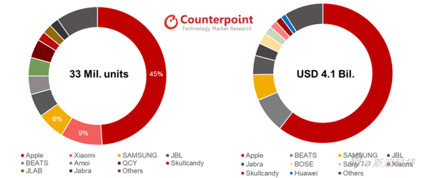 苹果第一代无线蓝牙耳机Airpods于2016年发布,当时刚上市一个月就拿下美国无线耳机线上市场26%的份额,销量达到了美国市场无线耳机销量月均值的10倍,实际上Airpods已经火了3年,只是最近新一代耳机发布后持续的供不应求才引起市场的广泛关注。根据研究机构Counterpoint Research的一份新报告,无线耳机市场在上一个季度出货量大幅增长,全球TWS无线耳机市场规模达到3300万部(41亿美元),环比增长22%,苹果品牌在销量上占比45%,由于售价远高于其他品牌,在销售额上占比超过60%。市场预计今年Airpods销量6000万部,明年将超过1亿部,而2017年销量不过1500万部。这款产品给苹果带来的收入将超过iPod曾给苹果带来的收入峰值,已成为后乔布斯时代的现象级产品。