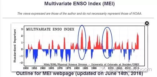 根据来自NOAA(美国国家海洋和大气管理局)的厄尔尼诺指数,可以清晰看到,1982-83,1997-98和2015-2016年属于三次比较显著的厄尔尼诺现象。一般厄尔尼诺退去发生在次年的(如1998年和2016年)的4-5月份;从近期的指标走势来看,本轮厄尔尼诺确实已至尾声。