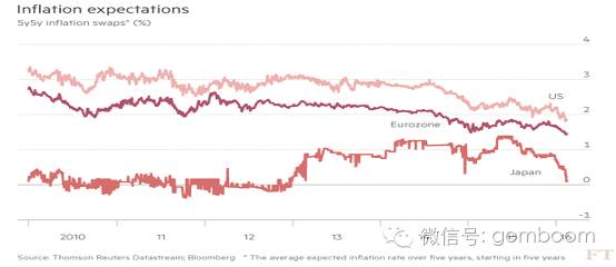 由于长期通缩的危害及其自我加强性,其对于成熟国家的央行而言(即有一定纪律约束),已经是达成共识的第一大敌。可惜的是,前有日本20年未走出通缩阴影,后有欧洲似乎要重蹈覆辙,连美国和中国也处于通缩的边缘状态。由下图可见,美欧日预期5年后的5年通胀率这一重要指标仍处于下行轨道,表示全球发达国家的长期通缩预期仍然强烈。在这一状况解除之前,全球央行仍会以战通缩为主要目标。