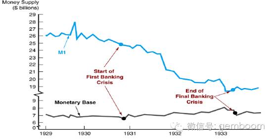 美联储的第一个失误是在危机发生时坐视不理。1913年成立的美联储毕竟还是太年轻,受传统自由市场理念的束缚,不知道在危机冲击下个人和企业的避险趋向会导致流动性不足,必须中央银行出手才能避免陷入通缩。从下图可见,大萧条期间由于货币乘数下降,M1持续降低,社会陷入严重通缩陷阱。