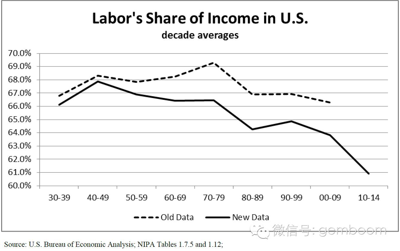 当然,我们并不是说全球不平等现象不重要,而是相对于媒体带给普通民众的认识,这一现象被夸大了。不平等现象是长期演变的,并非短期突然形成,也与08金融危机无关(但民众的感受会受金融危机的激发而变得强烈)。以美国为例,几十年以来,其国民收入中劳动力占比一直在65%到68%之间波动(资本所得为32%到35%),相对比较稳定。只有在2000年之后,劳动力所得占比才持续下降到61%附近。由于美国企业的研发开支占比越来越高。如果把资本方的研发开支处理为成本而非利润(美国统计局认为研发开支属于利润,因为企业获得了“知识”这一无形资产),即将下图实线还原为虚线,则情况看起来并没有那么遭,在2009年劳动力收入占比仍在66%以上。