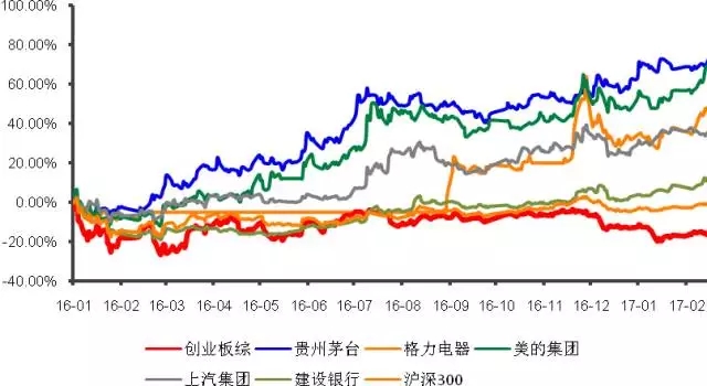 反观过去一年市场的波动特征,也开始发生了本质性的变化。个股的急涨急跌开始变得越来越少,取而代之是大白马大蓝筹以退一进二的方式稳步上涨。其中贵州茅台、格力电器、美的集团、上汽集团这些我们之前总是觉得不够快的个股成为全市场的明星股。从下图中我们可以明显地发现贵州茅台、美的集团远远超越指数80-100个点。甚至建设银行这样的股票也开始远远领先指数。