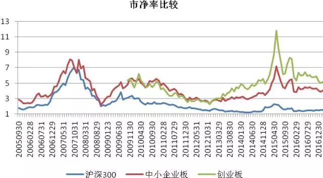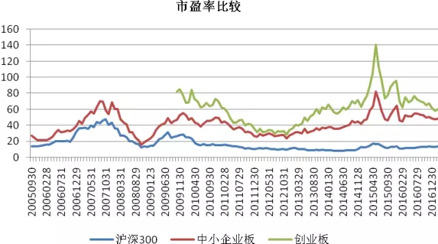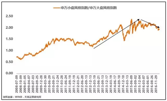 在这之前,我们再来看一个指数,申万小盘风格指数/申万大盘指数。从下图中我们可以看出,小盘股持续地战胜大盘股始于2012年12月止于2016年12月,刚好对应于过去4年的成长股大牛市。我们知道,过去的转型成长股无疑是最大的明星,业绩增长固然是很重要一个原因,但估值的抬升不能不说是一个重要原因(这个后面再述)。