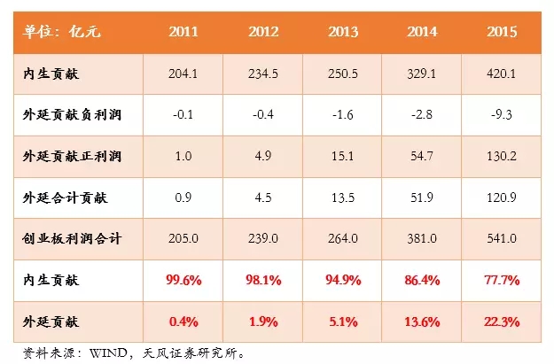 从上图中我们可以看出来,外延并购对创业板的盈利发挥着至关重要的作用。2015年创业板公司的全部利润中,你会发现有超过22%来自于收购后并表的公司,而创业板2015年全年20%多的盈利增速中,外延收购的标的贡献了10%以上的增速。