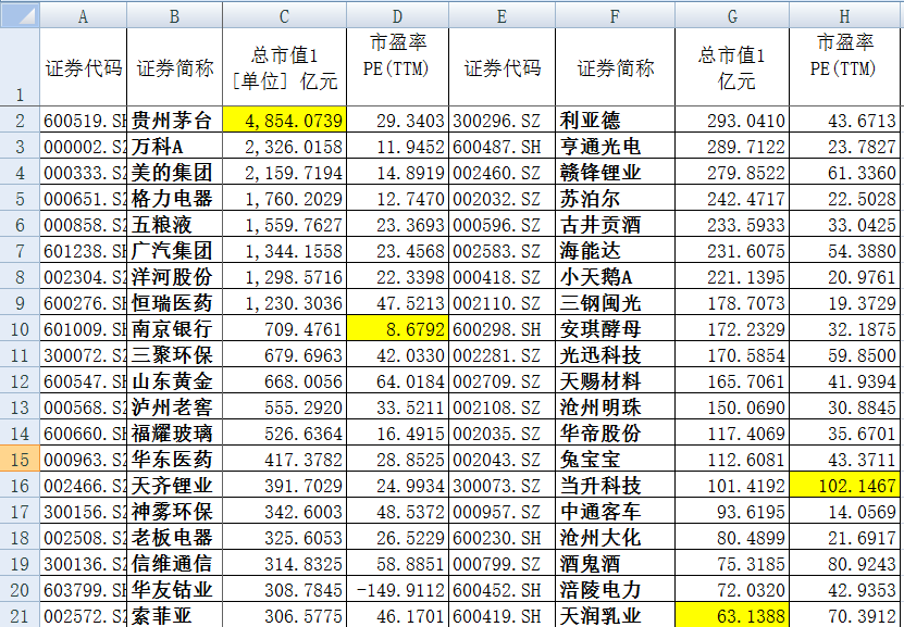 其次,截至3月20日A股所有股票中(扣除新股和重组并购)已经有近200家公司股价超过2015年6月12日上证5178点时候的股价高点。我们选取比较有代表性的40家公司,可以看到这些公司分散在上证、深证、中小板、创业板和不同的各个行业之中,市值跨度从贵州茅台的近5000亿市值到天润乳业的63亿市值,估值区间(PEttm扣除负值)从最高的上百倍到最低的8倍。
