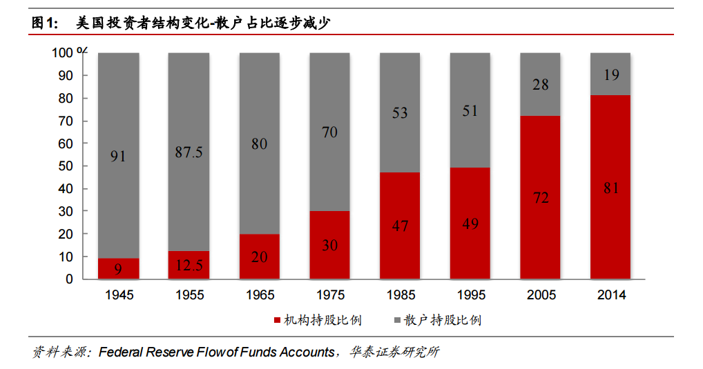 其次,会带来市场参与者结构的变化。同样以美股为例,20世纪50年代后,美股经历机构投资者占比迅速上升的过程,从不到10%的占比直到目前稳定在80%左右。这背后除了有美国退休养老金入市、交易机制复杂、金融衍生品市场发展等等多重因素,当然也与市场波动变小、总体预期收益降低、分化严重的状态有非常大的关系。而现在的A股市场与当初美股80年代的情况非常类似,机构占比50%左右,同时我们也正在经历私募基金行业大发展,保险、银行理财投资者的壮大以及未来养老金入市的进程,加上A股市场新的趋势的延续,相信投资者结构也会经历美国已经发生的过程。