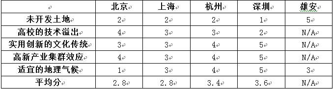 那么雄安未来可能成为硅谷吗?或者说中国的硅谷在哪里?我们试着对比一下北京,上海,杭州,深圳,雄安五地。各项满分为5分。