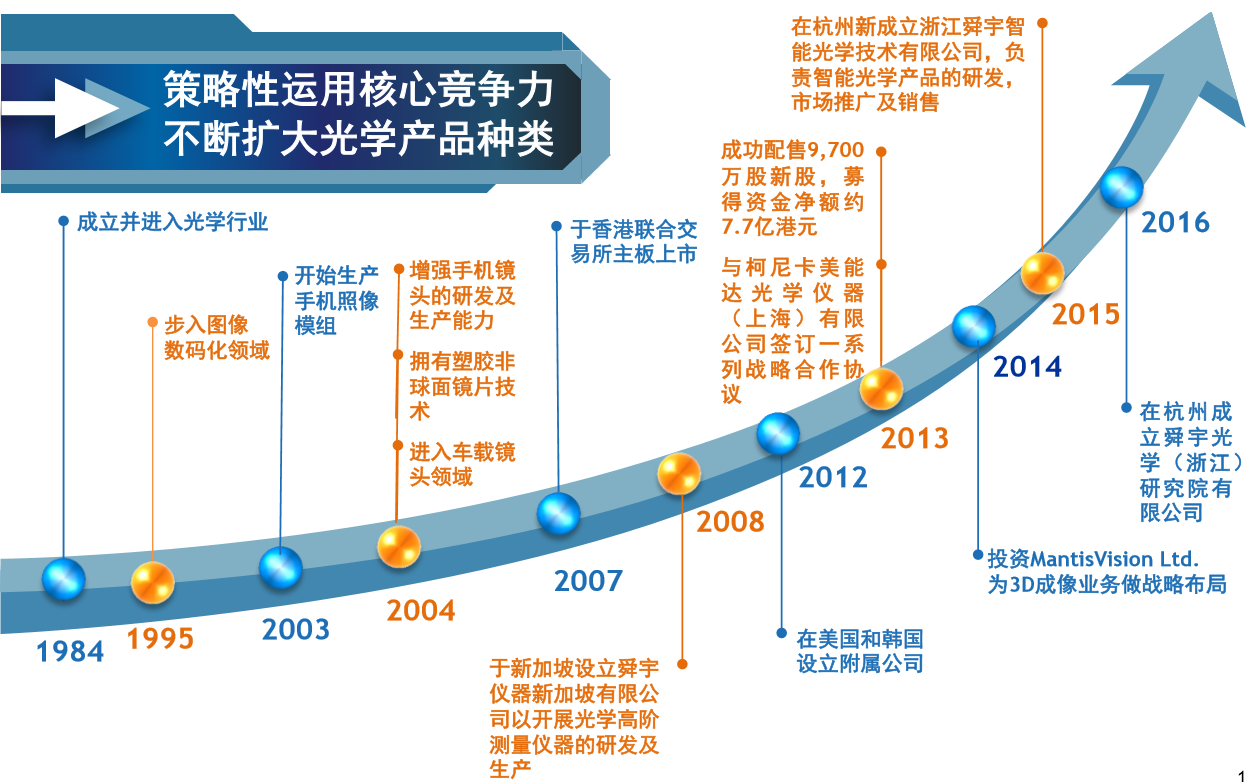 舜宇光学科技前身为成立于1984年的余姚市第二光学仪器厂,主营显微镜、光谱仪等光学仪器,1995年更名为浙江舜宇,2003年进入手机镜头模组行业,2004年进入车载镜头行业,于2007年6月在香港主板上市,现已成长为中国领先的综合光学产品制造商和光学影像系统解决方案提供商。