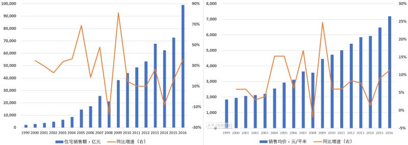 2014-2016年9月,中国经济面临下行压力,房地产库存较大,政府在“稳增长”和“去库存”的诉求下,接连出台刺激政策,手法与过去类似:放松限购限贷、加强信贷支持、税收减免。2015年3月开始,以深圳为代表的一线城市量价齐升,随后陆续扩散至二线和三、四线城市。2015、2016年全国住宅市场销售额加速上涨,政府调控效果明显。
