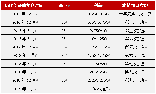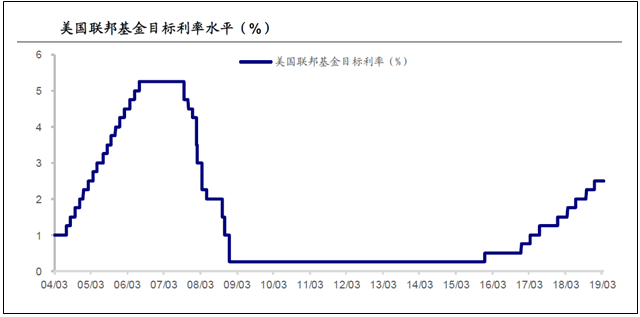 3月21日美联储议息会议吸引全球目光,美联储决定维持2.25%-2.50%的联邦基金目标利率不变。自2015年12月启动第一次加息以来,美联储五年来已经累计加息九次,将联邦基金目标利率从0提高至2.25%-2.50%区间。在2018年12月的议息会议上的预测还是2019年可能加息两次,三个月过去,美联储的利率决定发生了较大变化,部分超出市场预期,美联储起始于2015年的本轮加息周期可能已经接近尾声。